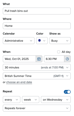 Now, this whole situation — of forgetting to roll out the bins on Wednesday evening, instead of Thursday morning — has happened not twice, but three times now, over the past 2-3 months. I’m not entirely sure what specifically changed in my life such that would’ve caused me to forget this weekly chore. Regardless,I’d really like to avoid these jump out of bed frantically instances. So, here’s one of the ways I am going to try and reduce the probability of that happening: adding an event to my calendar.
