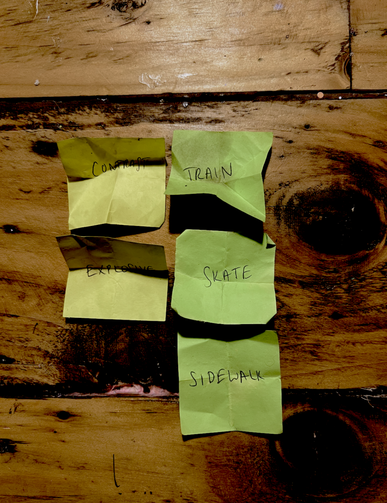 In this exercise, we randomly select two sticky notes, one green and one yellow. The green sticky notes are labeled with dance moves (e.g. pas de bourree, train, farmer); the yellow, quality of movement (e.g. contrast, explosive, turning). After pairing the two sticky notes, you dance a round (e.g. 1 minute) with the move with the quality of movement layered on top.